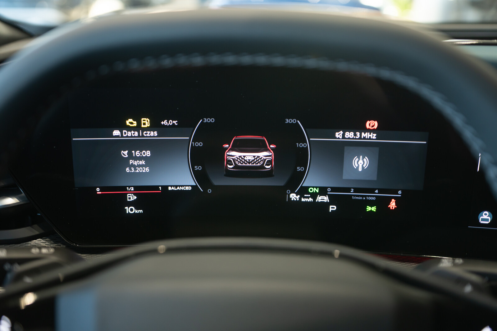 • sportowa 3-ramienna kierownica wielofunkcyjna, obszyta skórą, spłaszczona u dołu i na górze, z przyciskami zmiany przełożenia, aplikacjami w optyce chromu i emblematem S, prawy i lewy segment z obszyty perforowaną skórą, kontrastowy szew