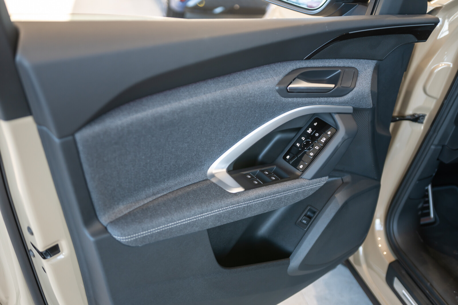 • górne elementy wnętrza pokryte tkaniną Kaskade¹, dolne elementy pokryte skórą ekologiczną: elementy dekoracyjne na tablicy rozdzielczej oraz w drzwiach i podłokietnikach z tkaniny Kaskade¹, kontrastowy szew na podłokietnikach w drzwiach, elementy na wysokości kolan na konsoli środkowej pokryte czarną skórą ekologiczną z kontrastowym szwem