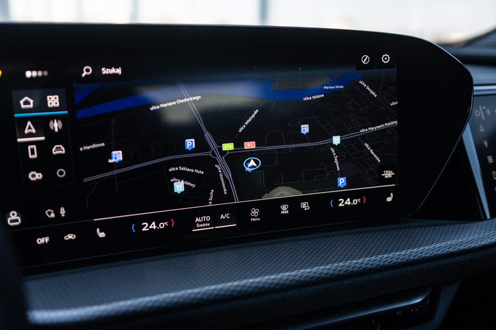 • sportowa 3-ramienna kierownica wielofunkcyjna, obszyta skórą, spłaszczona u dołu i na górze, z przyciskami zmiany przełożenia, aplikacjami w optyce chromu i emblematem S, prawy i lewy segment z obszyty perforowaną skórą, kontrastowy szew