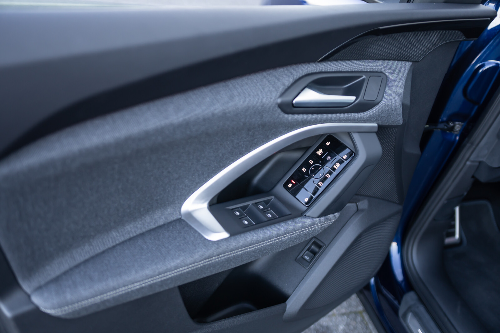 • górne elementy wnętrza pokryte tkaniną Kaskade¹, dolne elementy pokryte skórą ekologiczną: elementy dekoracyjne na tablicy rozdzielczej oraz w drzwiach i podłokietnikach z tkaniny Kaskade¹, kontrastowy szew na podłokietnikach w drzwiach, elementy na wysokości kolan na konsoli środkowej pokryte czarną skórą ekologiczną z kontrastowym szwem