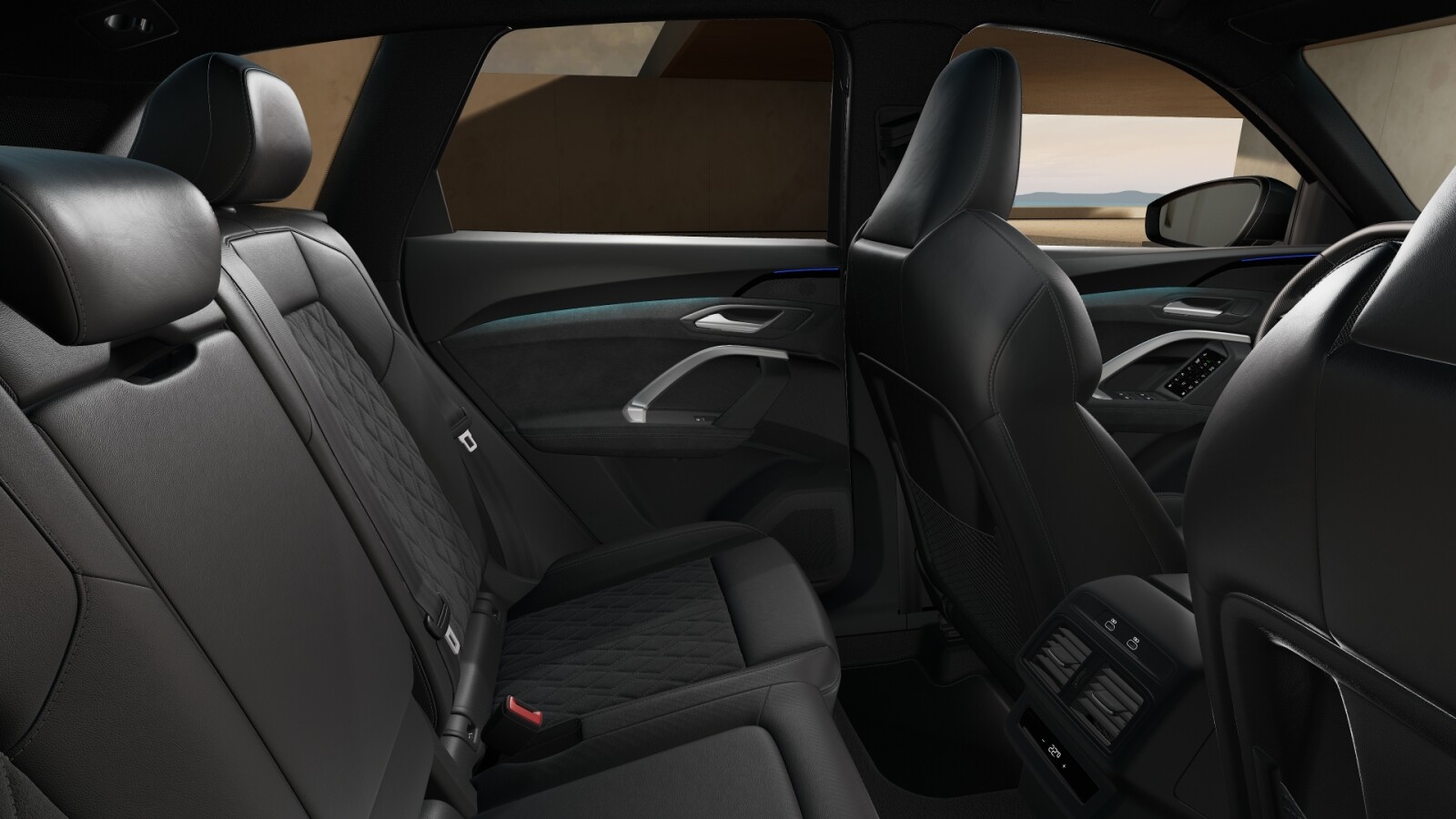 • środkowe części siedzeń obszyte czarną mikrofibrą Dinamica¹ z pikowaniem w romby, boki siedzeń obszyte czarną skórą, zagłówki pokryte czarną skórą ekologiczną, wytłoczone logo S na oparciach tylnych siedzeń, kontrastowy szew (tapicerka tylnych siedzeń dopasowana optycznie do siedzeń przednich)