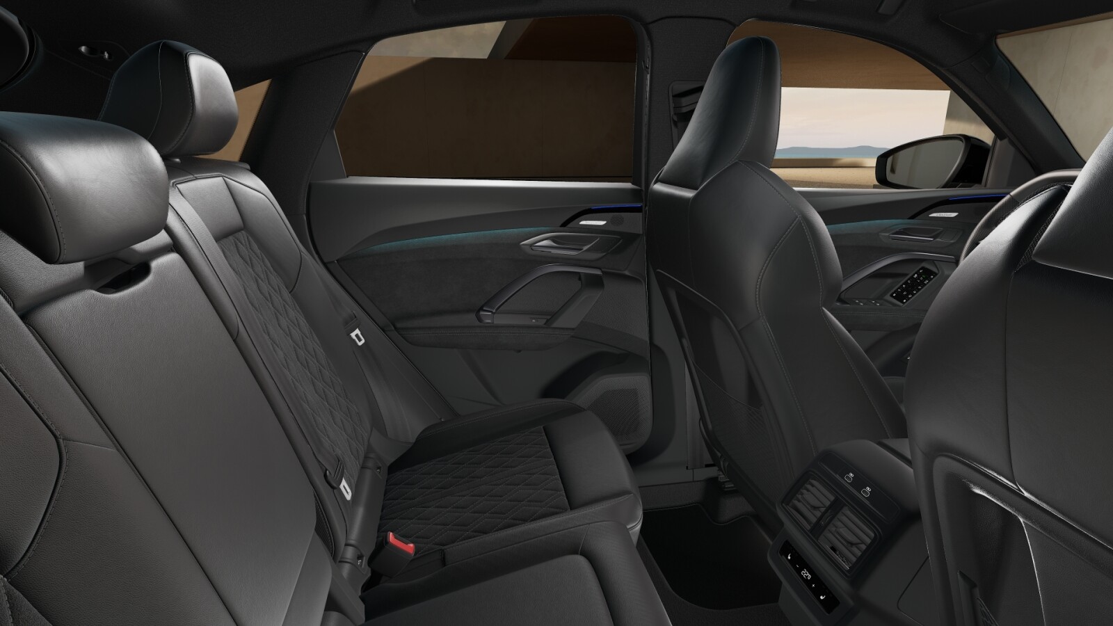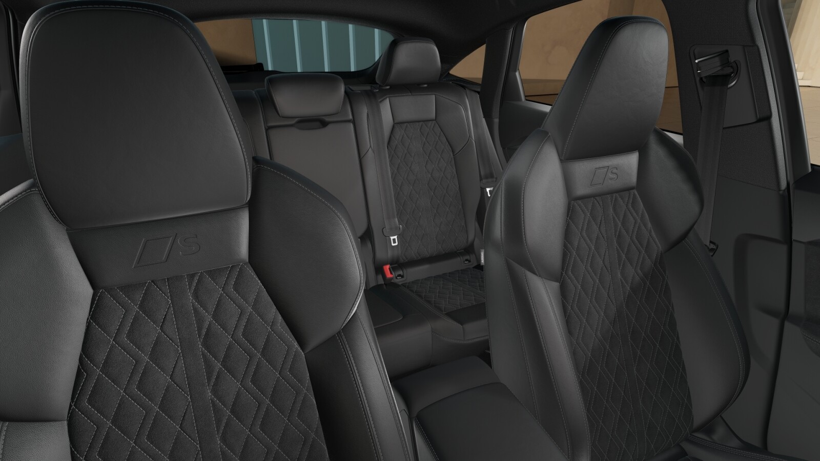 • środkowe części siedzeń obszyte czarną mikrofibrą Dinamica¹ z pikowaniem w romby, boki siedzeń obszyte czarną skórą, zagłówki pokryte czarną skórą ekologiczną, wytłoczone logo S na oparciach tylnych siedzeń, kontrastowy szew (tapicerka tylnych siedzeń dopasowana optycznie do siedzeń przednich)