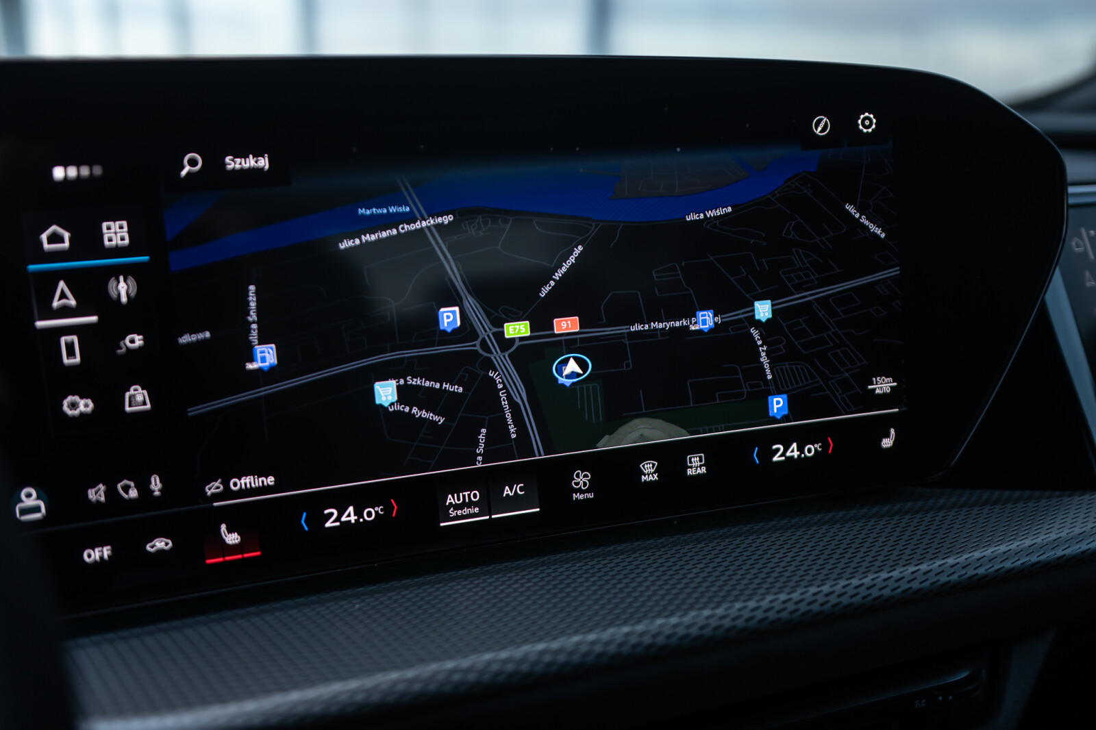 • sportowa 3-ramienna kierownica wielofunkcyjna, obszyta skórą, spłaszczona u dołu i na górze, z przyciskami zmiany przełożenia, aplikacjami w optyce chromu i emblematem S, prawy i lewy segment z obszyty perforowaną skórą, kontrastowy szew
