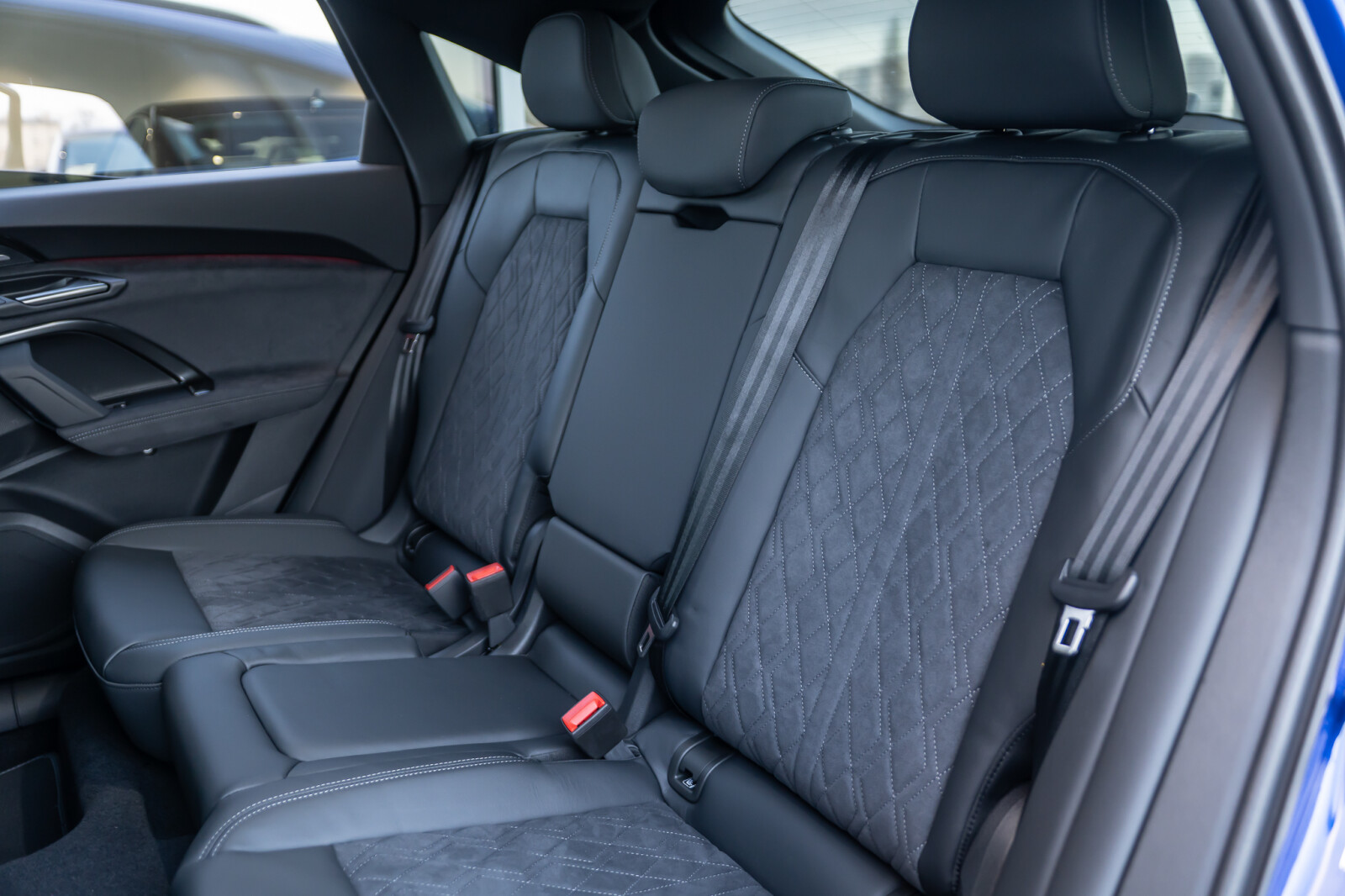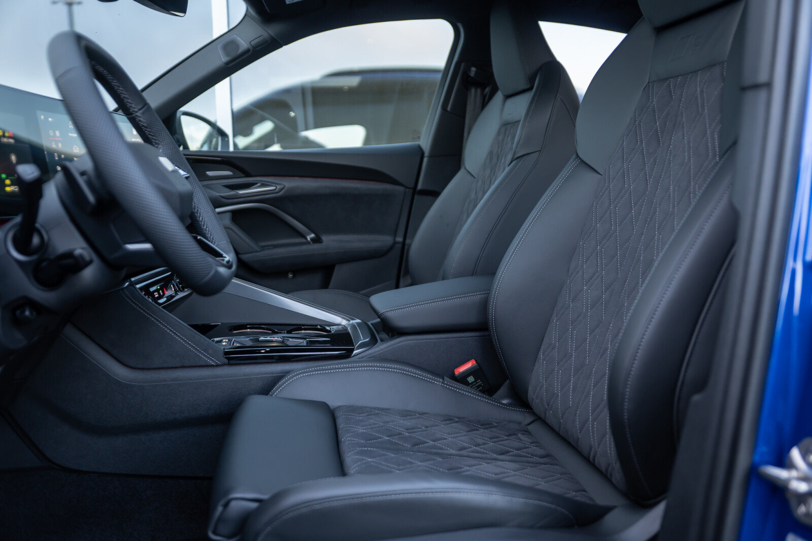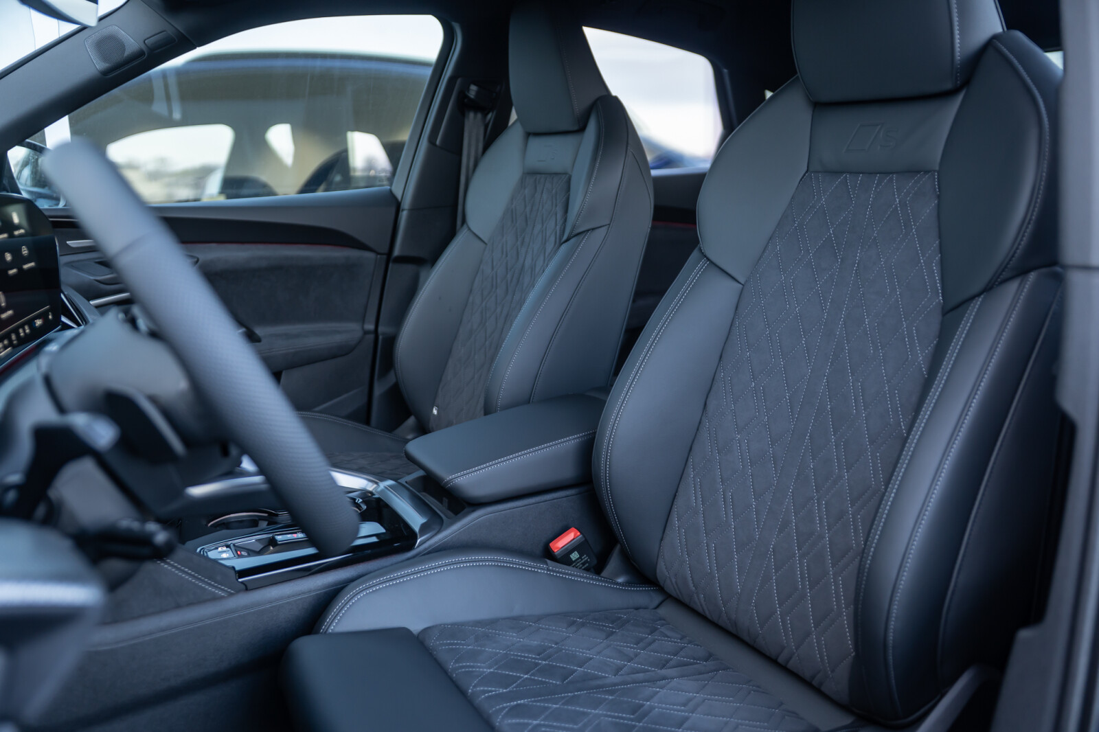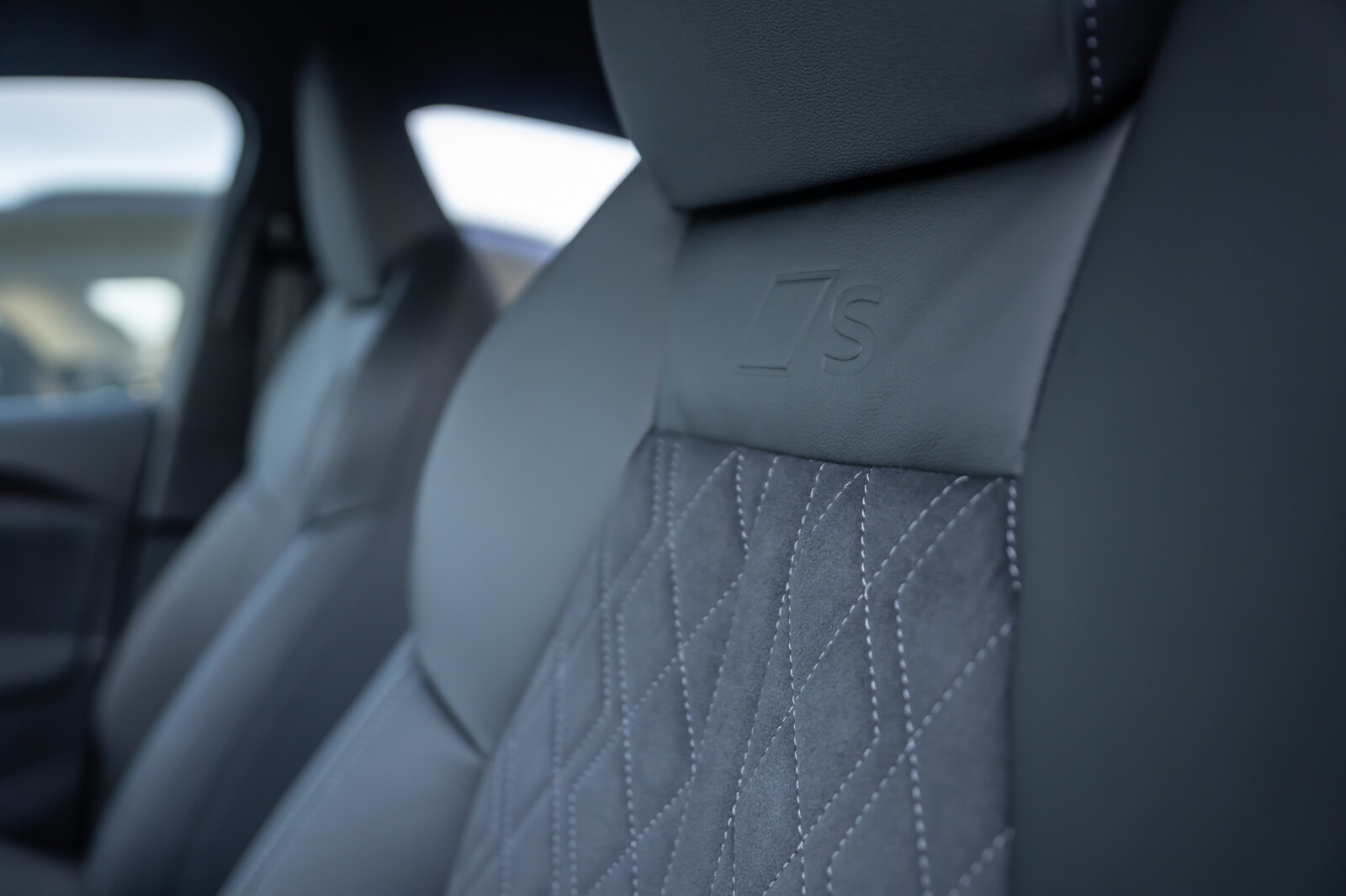 • środkowe części siedzeń obszyte czarną mikrofibrą Dinamica¹ z pikowaniem w romby, boki siedzeń obszyte czarną skórą, zagłówki pokryte czarną skórą ekologiczną, wytłoczone logo S na oparciach tylnych siedzeń, kontrastowy szew (tapicerka tylnych siedzeń dopasowana optycznie do siedzeń przednich)