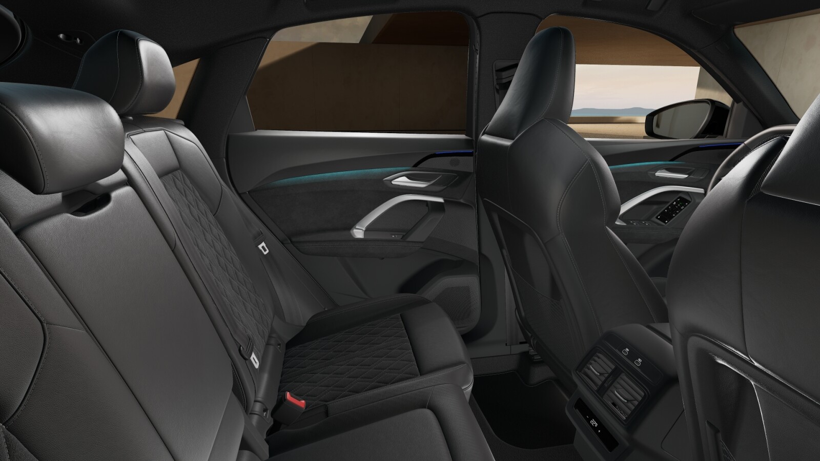 • środkowe części siedzeń obszyte czarną mikrofibrą Dinamica¹ z pikowaniem w romby, boki siedzeń obszyte czarną skórą, zagłówki pokryte czarną skórą ekologiczną, wytłoczone logo S na oparciach tylnych siedzeń, kontrastowy szew (tapicerka tylnych siedzeń dopasowana optycznie do siedzeń przednich)