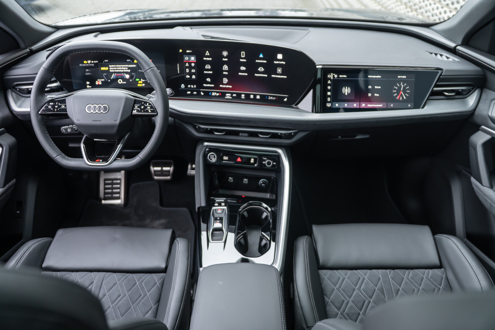 • sportowa 3-ramienna kierownica wielofunkcyjna, obszyta skórą, spłaszczona u dołu i na górze, z przyciskami zmiany przełożenia, aplikacjami w optyce chromu i emblematem S, prawy i lewy segment z obszyty perforowaną skórą, kontrastowy szew