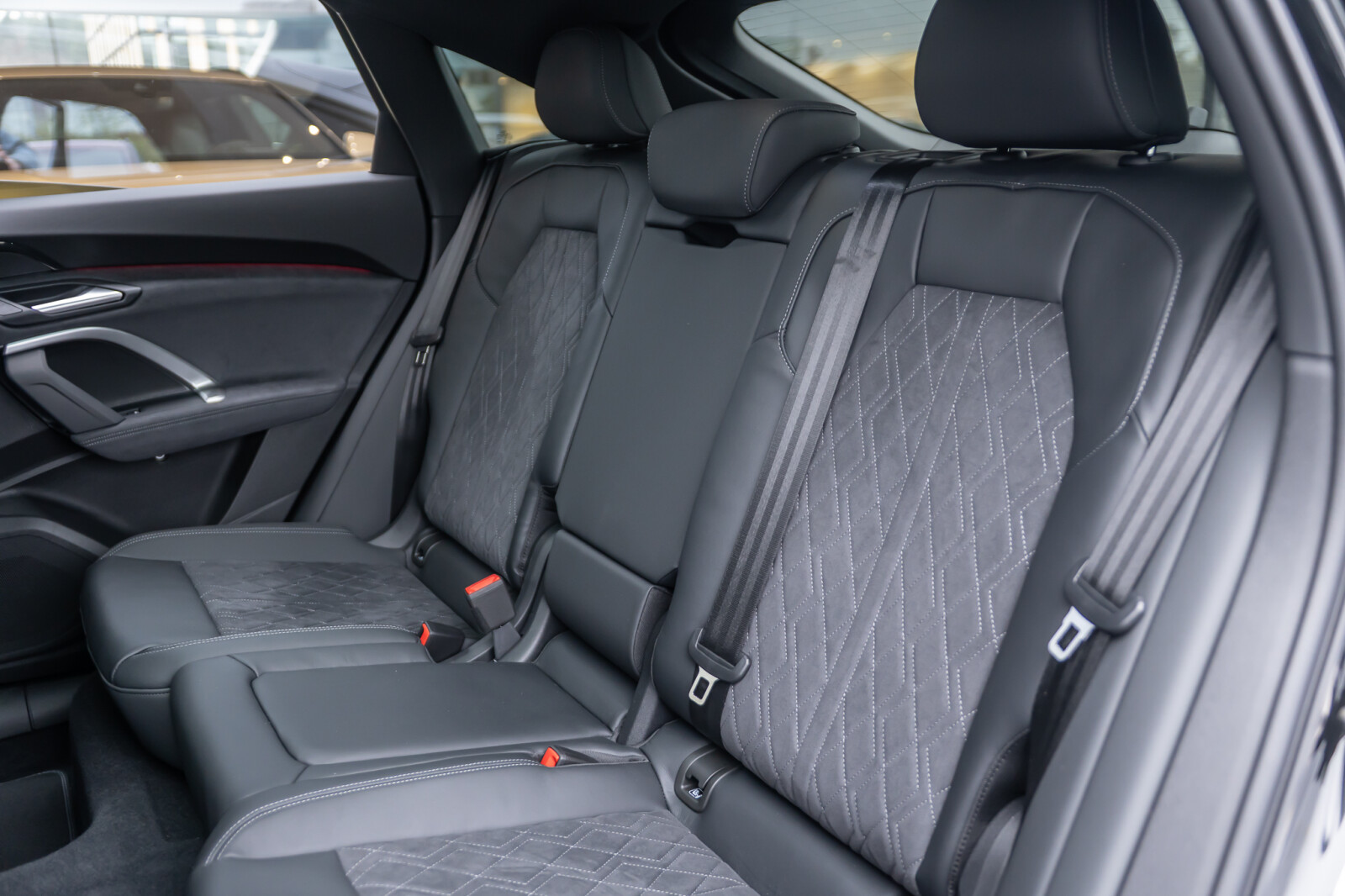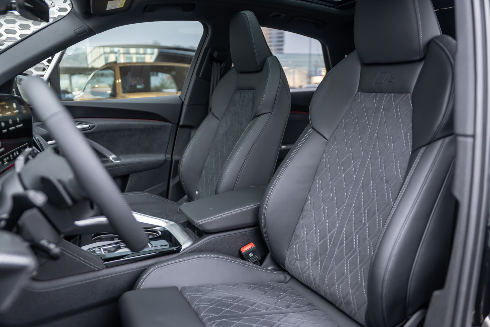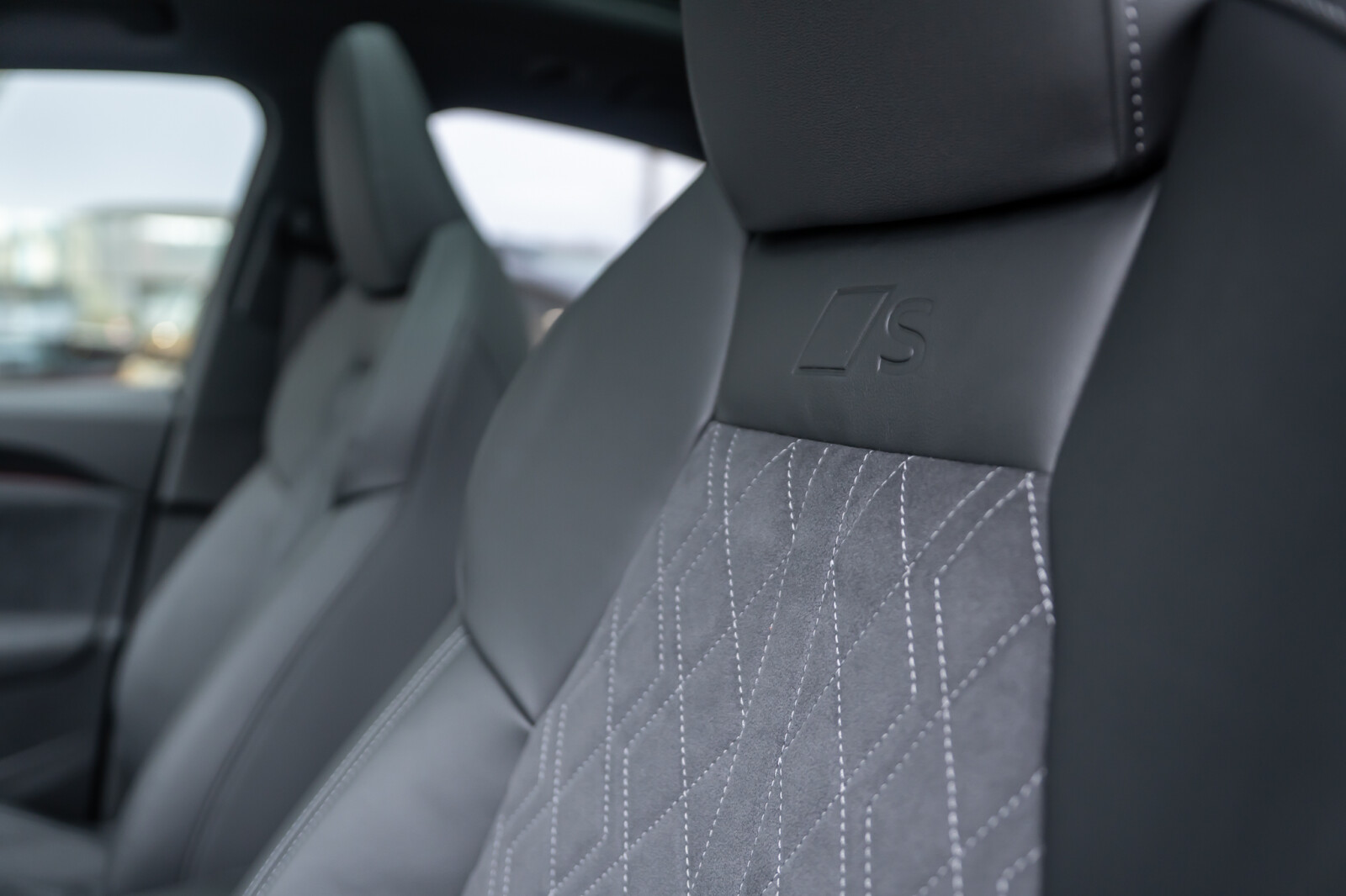 • środkowe części siedzeń obszyte czarną mikrofibrą Dinamica¹ z pikowaniem w romby, boki siedzeń obszyte czarną skórą, zagłówki pokryte czarną skórą ekologiczną, wytłoczone logo S na oparciach tylnych siedzeń, kontrastowy szew (tapicerka tylnych siedzeń dopasowana optycznie do siedzeń przednich)
