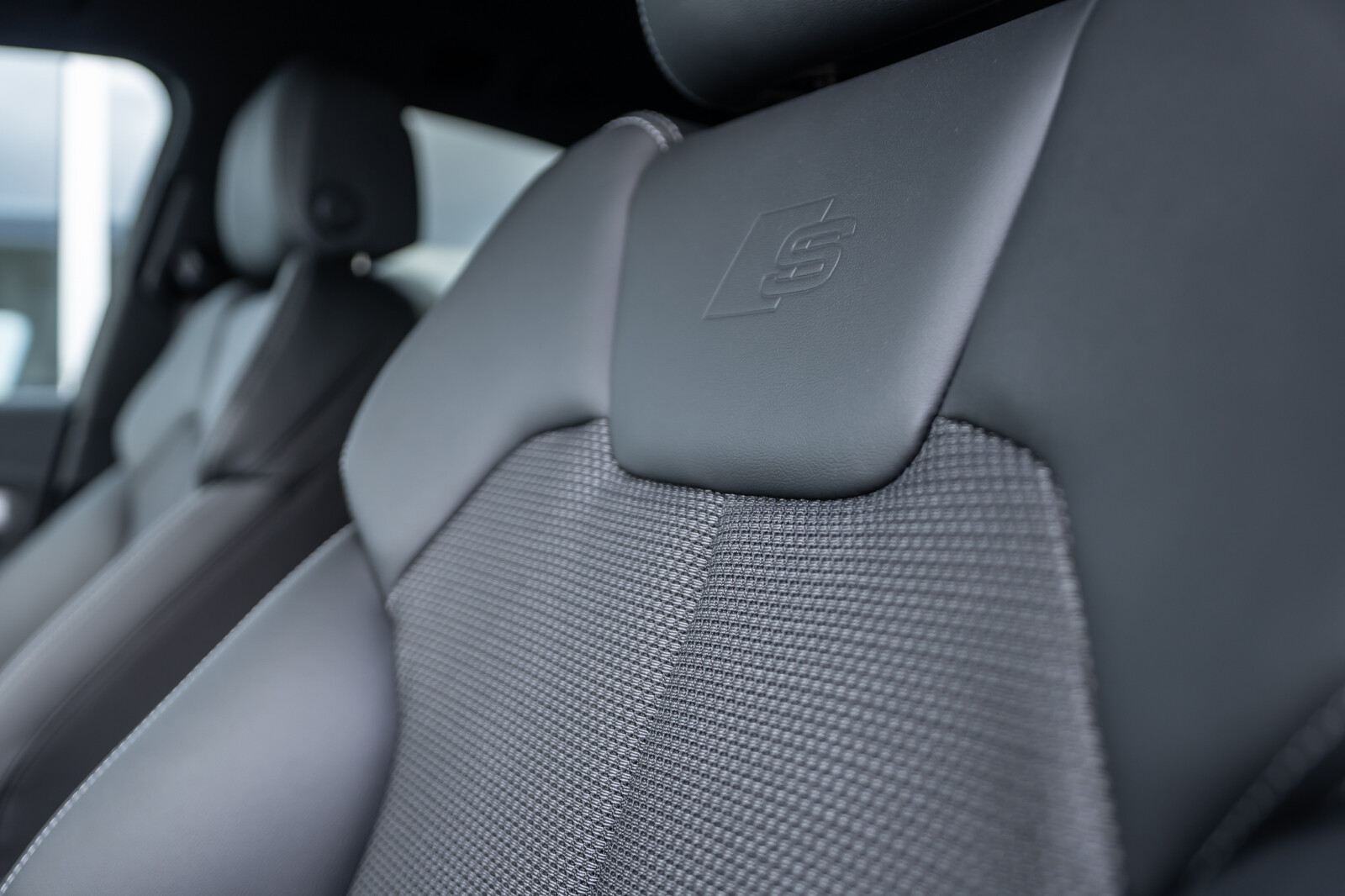 • kombinacja tkanina Sequenz/skóra ze środkowymi częściami przednich siedzeń i obu skrajnych siedzeń z tyłu z tkaniny Sequenz, boki siedzeń, środkowe części zagłówków z czarnej skóry z kontrastowym szwem, logo S na oparciach przednich siedzeń