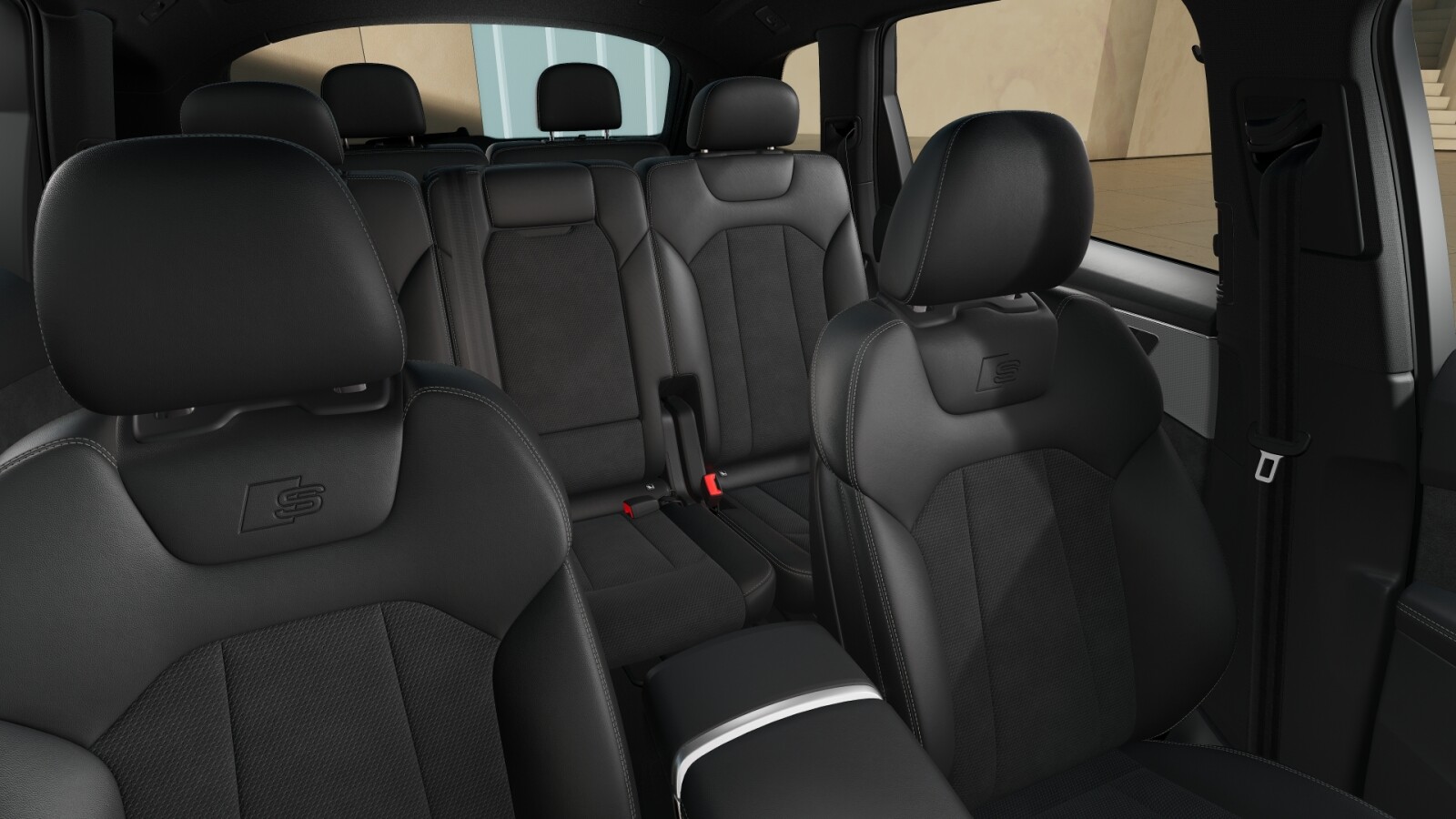 • tapicerka z kombinacji mikrofibry Dinamica Frequenz/skóry w kolorze czarnym z kontrastowym szwem i wytłoczonym logo S w oparciach przednich siedzeń