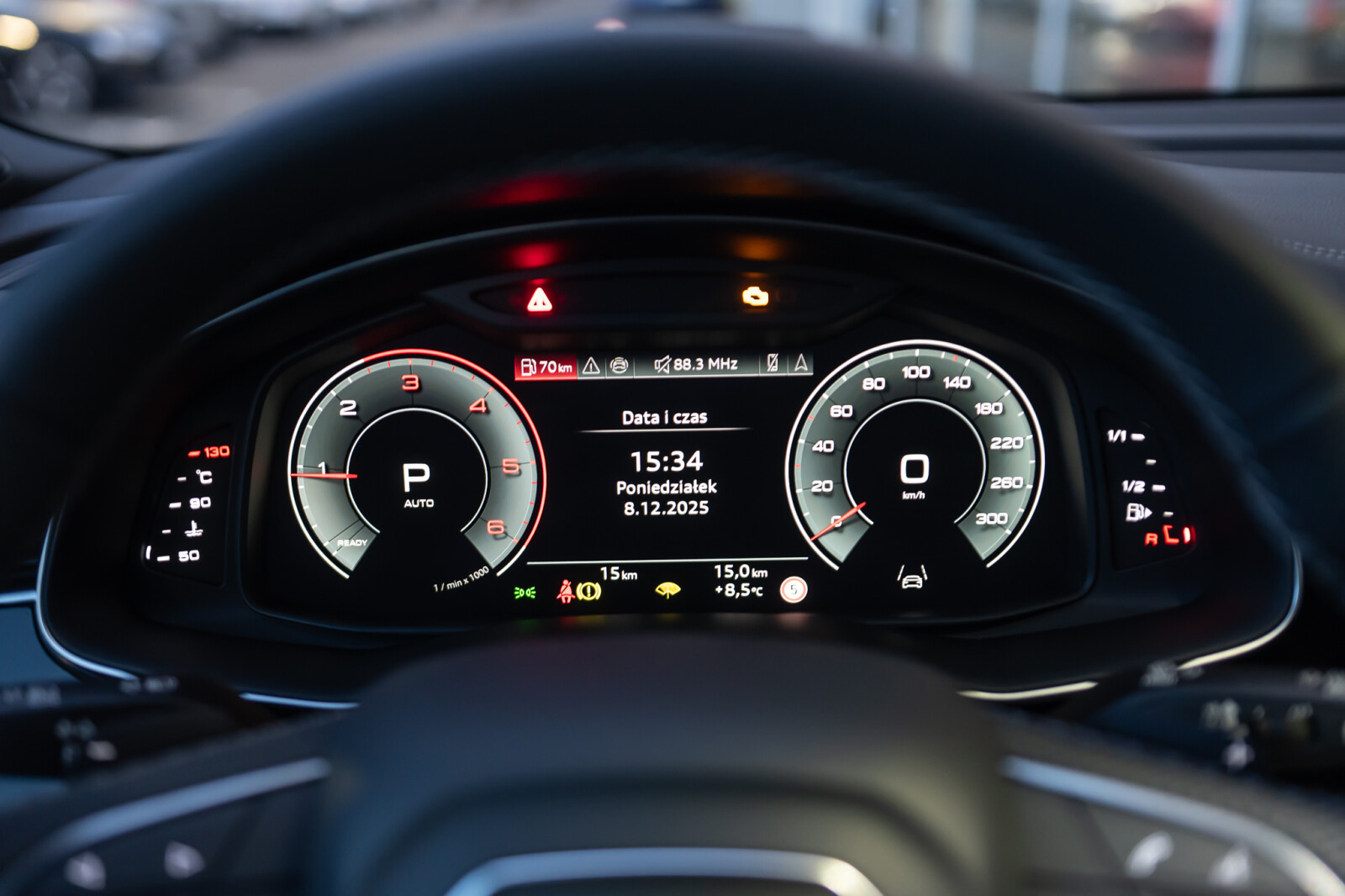 – Kierownica wielofunkcyjna, 3-ramienna, z przełącznikami zmiany przełożenia, obszyta skórą i ogrzewana