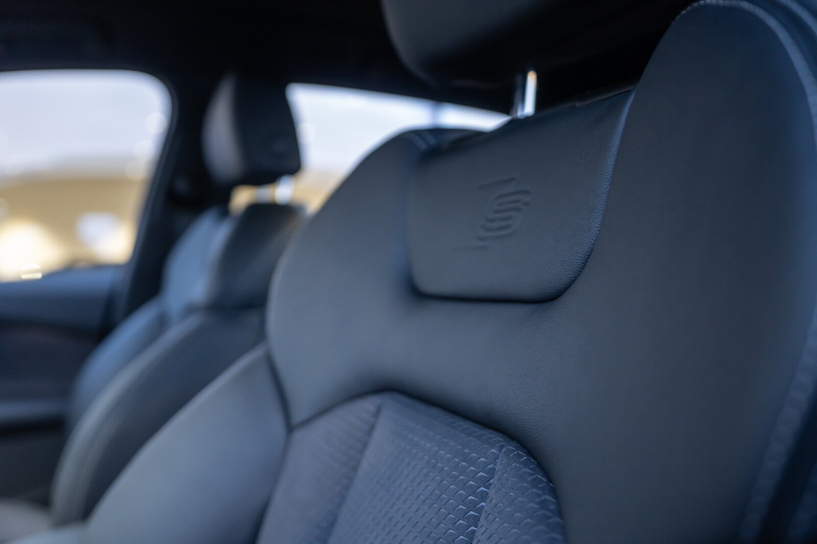 • tapicerka z kombinacji mikrofibry Dinamica Frequenz/skóry w kolorze czarnym z kontrastowym szwem i wytłoczonym logo S w oparciach przednich siedzeń
