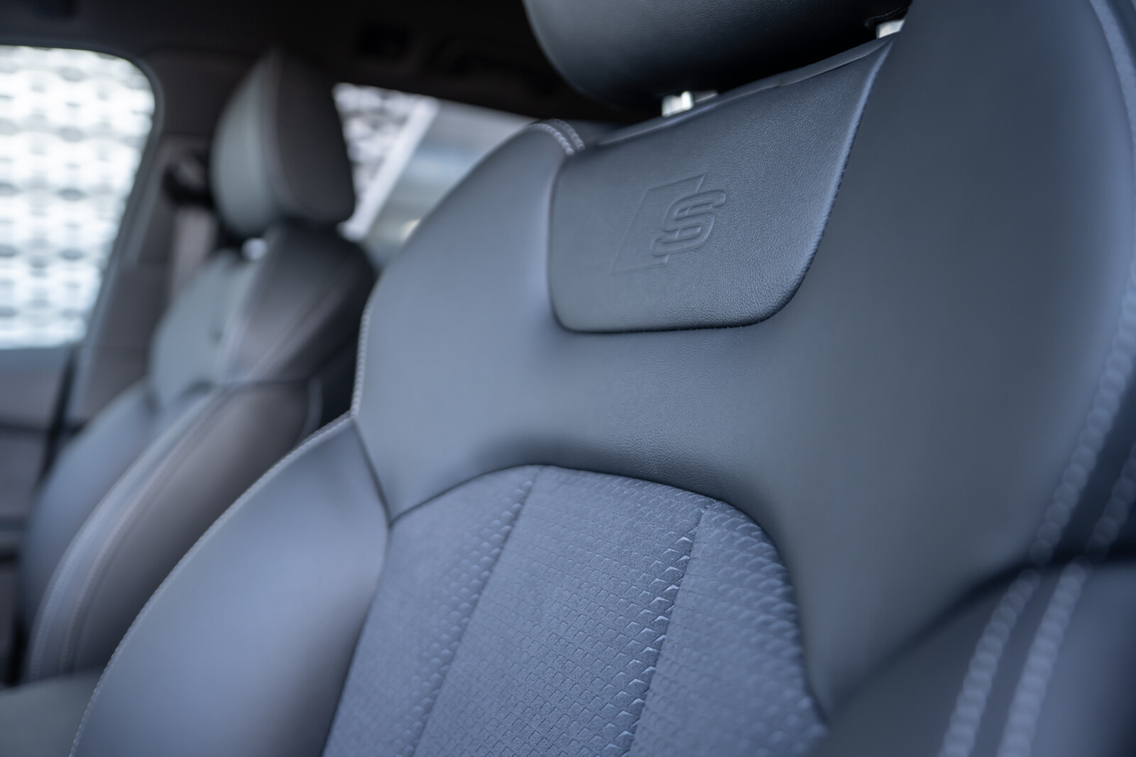 • tapicerka z kombinacji mikrofibry Dinamica Frequenz/skóry w kolorze czarnym z kontrastowym szwem i wytłoczonym logo S w oparciach przednich siedzeń