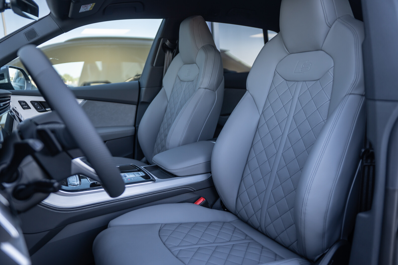 • 3-ramienna kierownica wielofunkcyjna z przyciskami zmiany przełożenia, obszyta czarną skórą, boczne segmenty ze skóry perforowanej, emblemat S line oraz chromowane aplikacje
