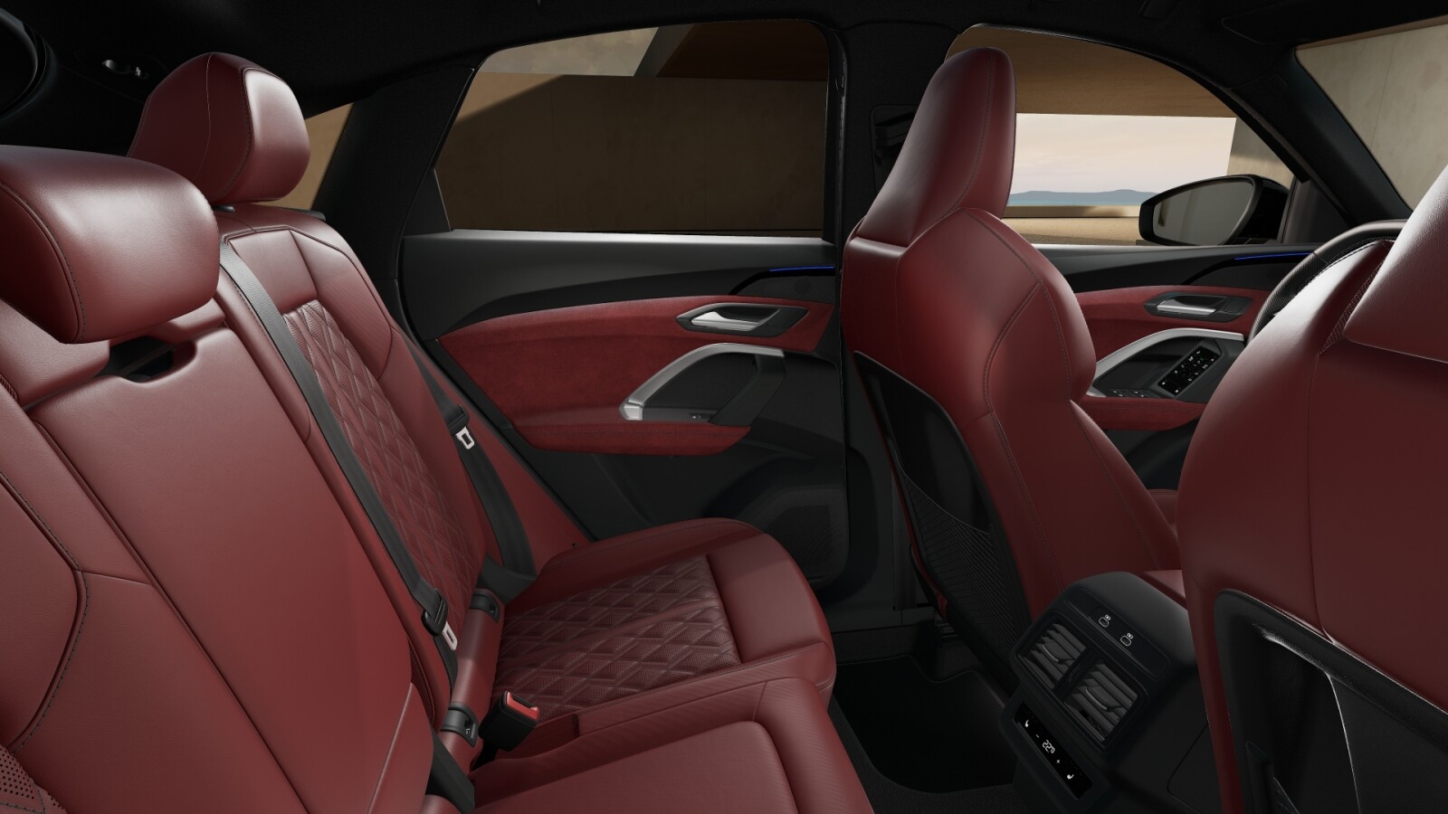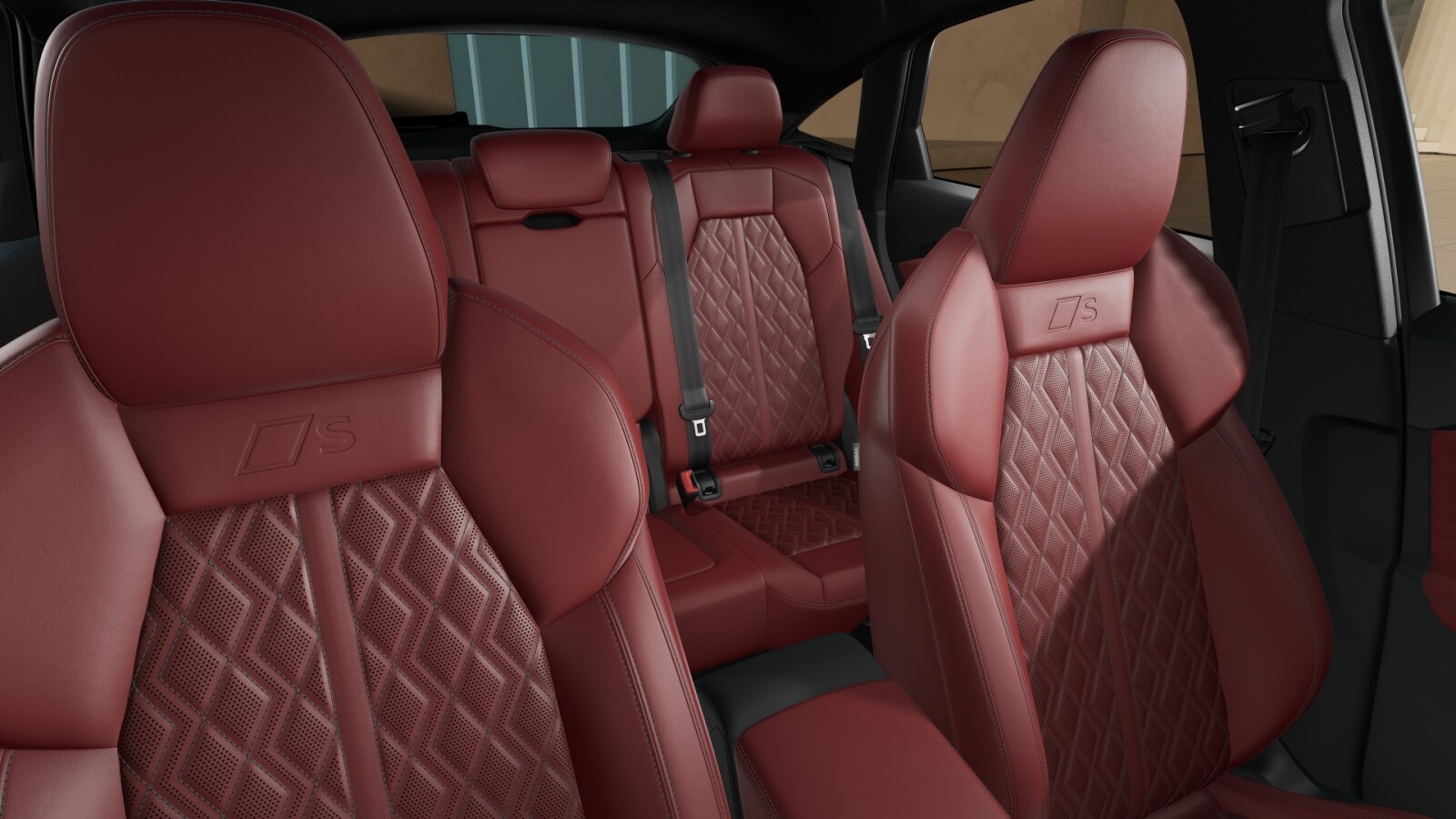 • wentylowana środkowa część przednich siedzeń i niewentylowana środkowa część skrajnych siedzeń z tyłu obszyta perforowaną skórą w kolorze czerwonym Arras z pikowaniem w romby, boki siedzeń i zagłówki obszyte skórą Feinnappa czerwoną Arras; kontrastowy szew (tapicerka tylnych siedzeń dopasowana do siedzeń przednich)