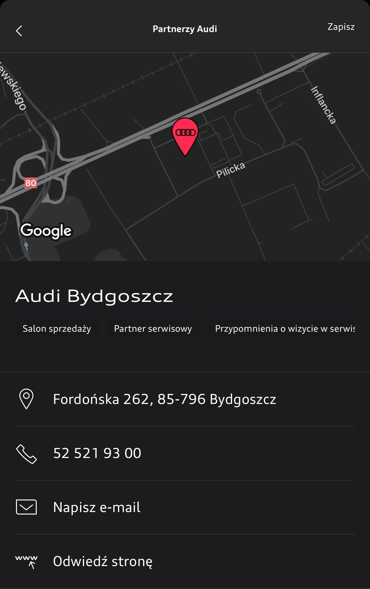 W związku otwarciem nowego salonu i serwisu prosimy o zaktualizowanie wyboru Partnera Serwisowego dla Audi Bydgoszcz, ul. Fordońska 262 w aplikacji MyAudi. Dzięki temu zyskają Państwo: